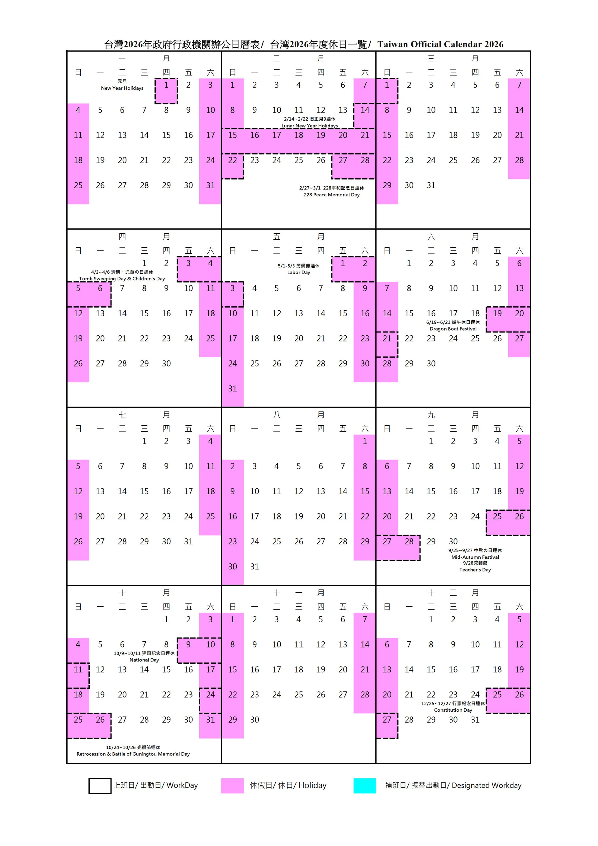 台灣2026年政府行政機關辦公日曆表