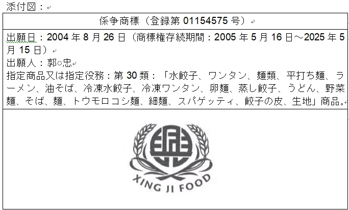 (一)調べたところ、係争商標は麦穂とリボンで囲まれた、デザインを施された「興」の文字と、その下方に配置される「XING JI FOOD」とで構成され、第30類:「水餃子、ワンタン、冷凍水餃子、冷凍ワンタン、蒸し餃子」商品(当裁判所ファイル㈠第203頁を参照)での使用を指定している。原告は係争商標が正当な理由なくして未使用又は使用の停止が継続して3年経過したものであると主張しており、参加人はこれを否認し、被許諾者が原告であること、参加人が3年内にいずれも係争商標を使用していることを示す証拠を提出した。これは本件の争点である、原告が登録取消を請求した日、即ち2020年10月8日前の3年以内の期間において係争商標が指定商品である「水餃子、ワンタン、冷凍水餃子、冷凍ワンタン、蒸し餃子」に使用されていた否かに係る事実を示すものである(当裁判所ファイル㈠第184頁の準備手続調書を参照)。ここで取消請求、訴願及び本件訴訟手続きにおいて参加人が提出した使用に係る証拠資料並びに当裁判所が職権で調査したサイト資料を斟酌し、以下のように分析する。