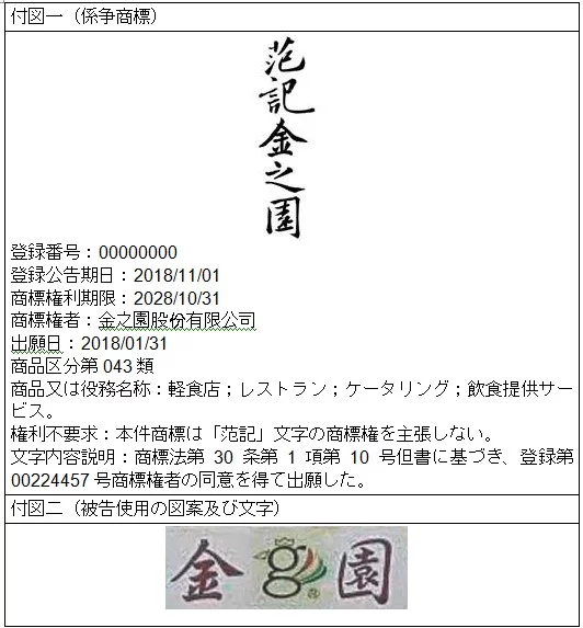(四)「范記金之園及び図」商標は、原告の法定代理人范家豪の母親洪維貞が1983年4月22日に登録出願し、権利存続期間は2023年10月15日までであり、商標の指定内容を「商品区分:第030類。商品または役務名称:各種弁当、穀物、小麦粉、でん粉及び他の穀粉とその混合製品」としている。